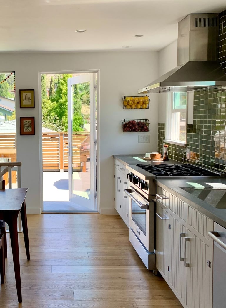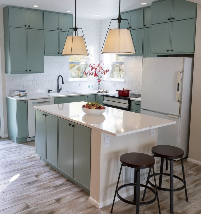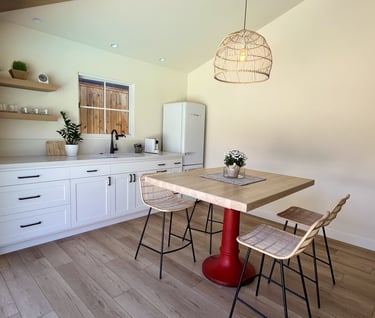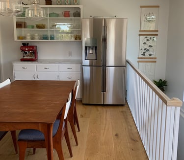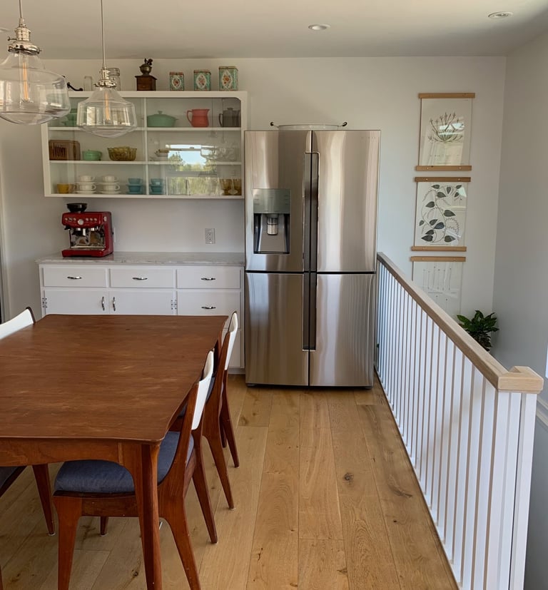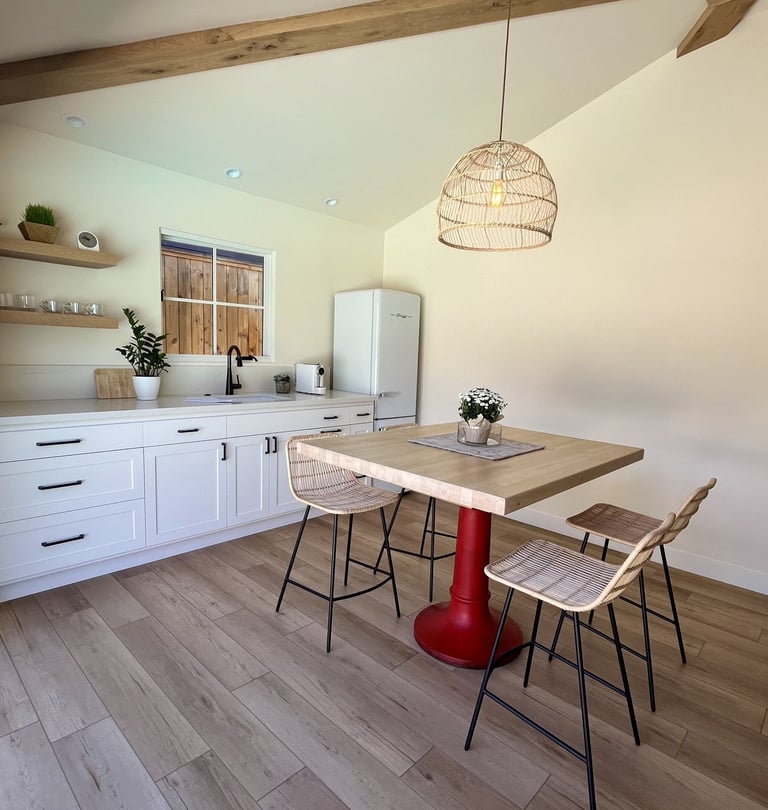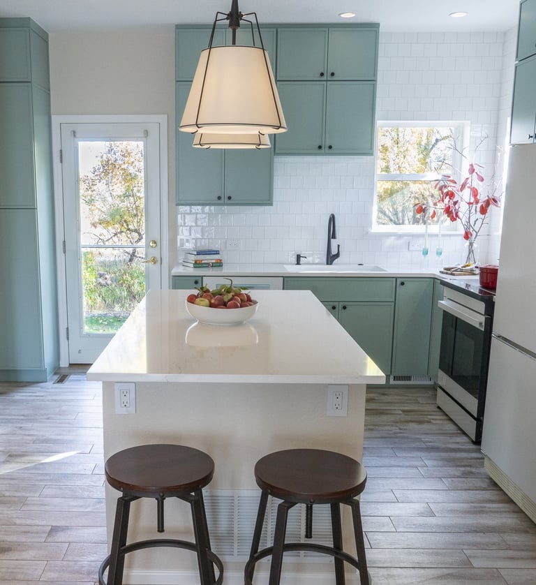While the floors and retro refrigerator remained, the rest of the kitchen was upgraded to include new cabinets, countertops, and backsplash tile.