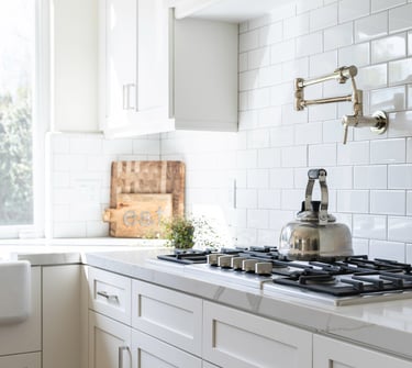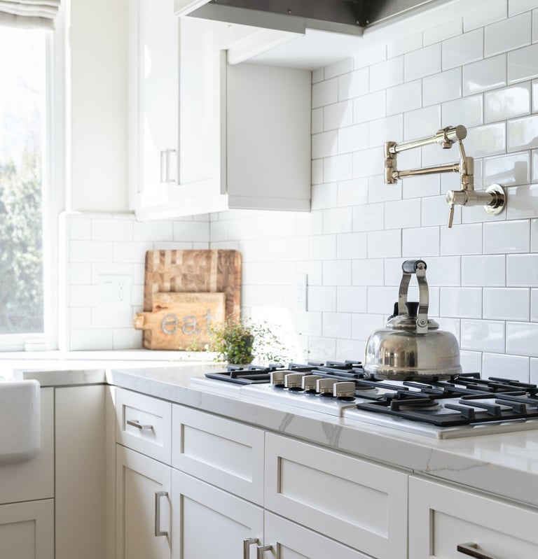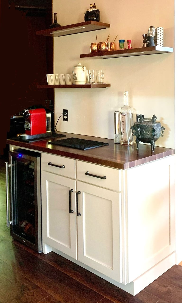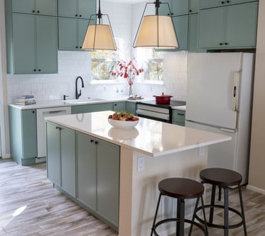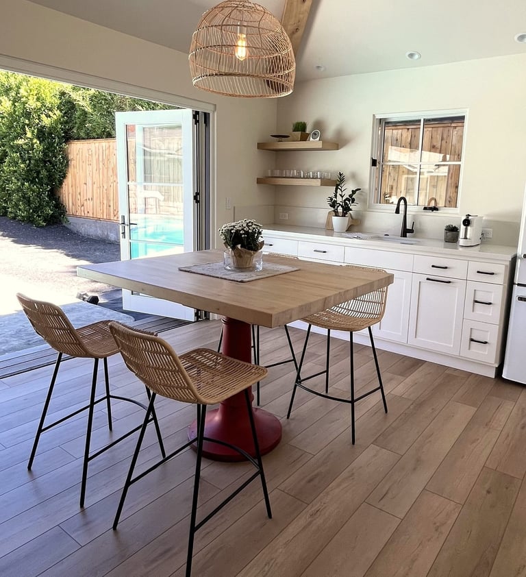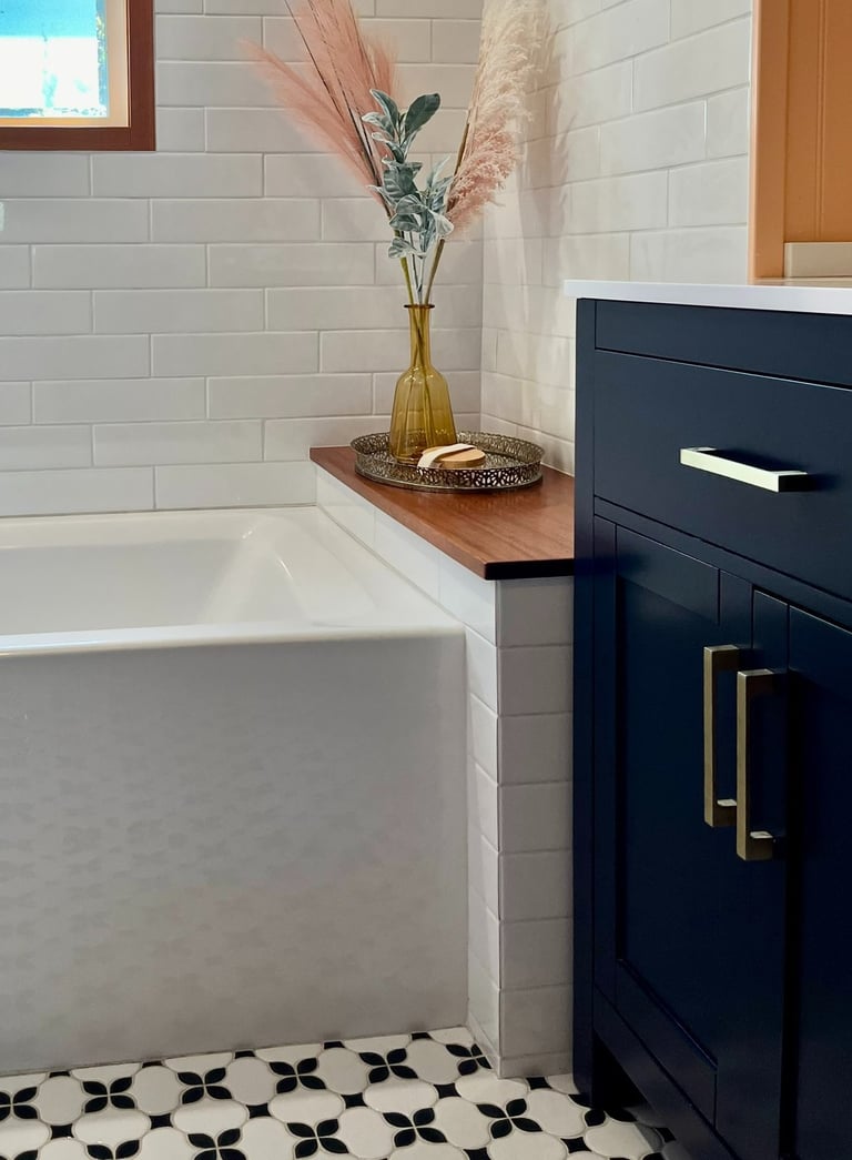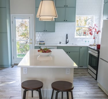 While the floors and retro refrigerator remained, the rest of the kitchen was upgraded to include new cabinets, countertops, and backsplash tile.