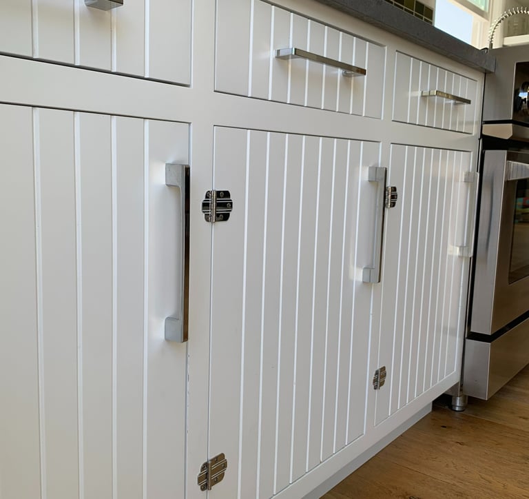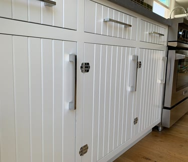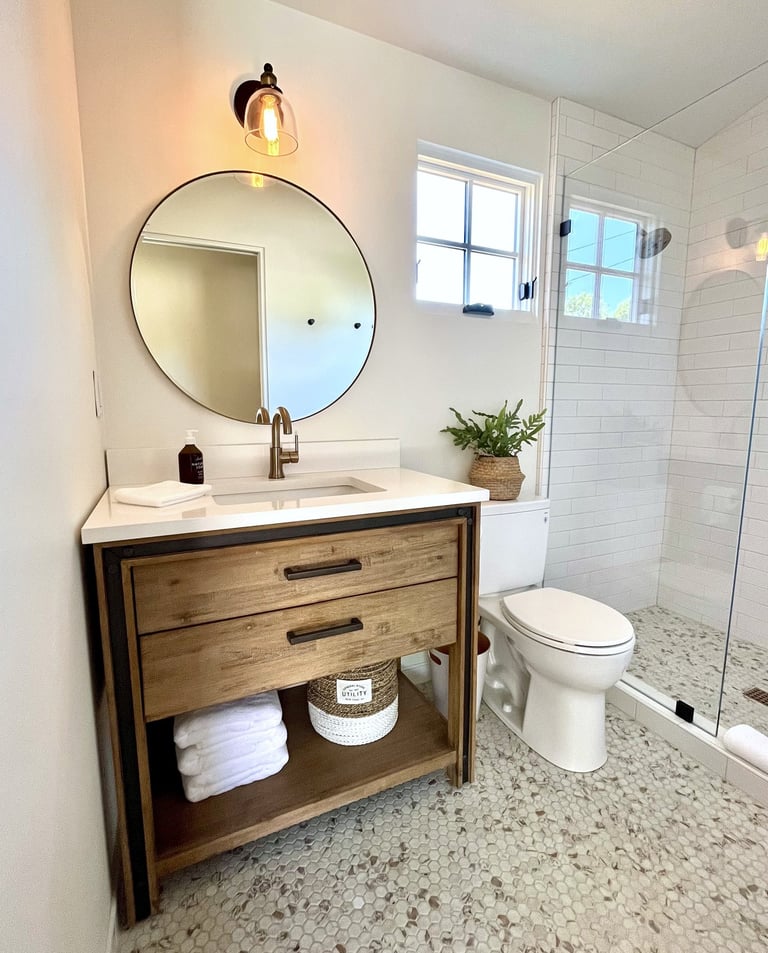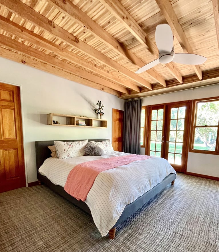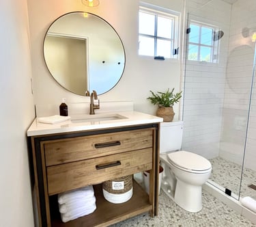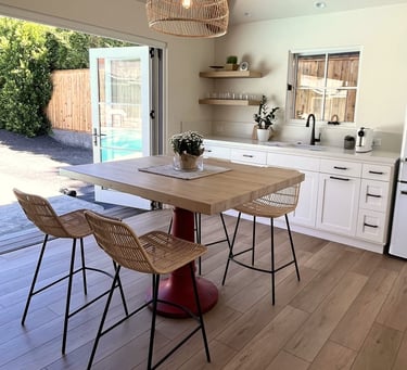Garage conversion to pool house renovation included new layout, vaulted ceilings, cabinetry, fixtures, finishes and furniture.