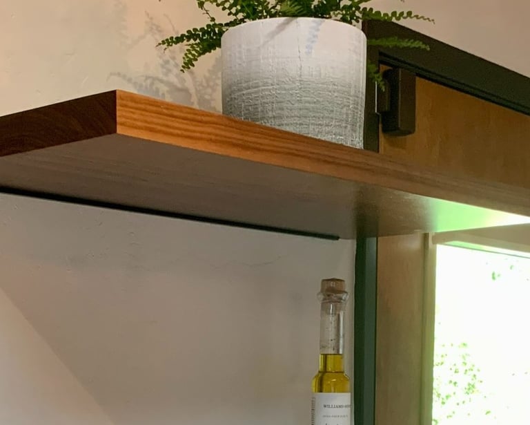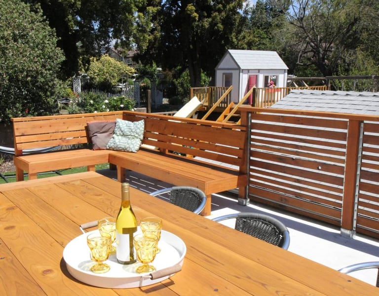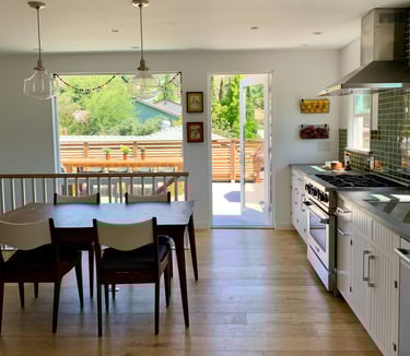 Kitchen and deck renovation included new walls + windows/doors layout, open stairs, custom cabinets, fixtures, finishes, and deck + handrail design